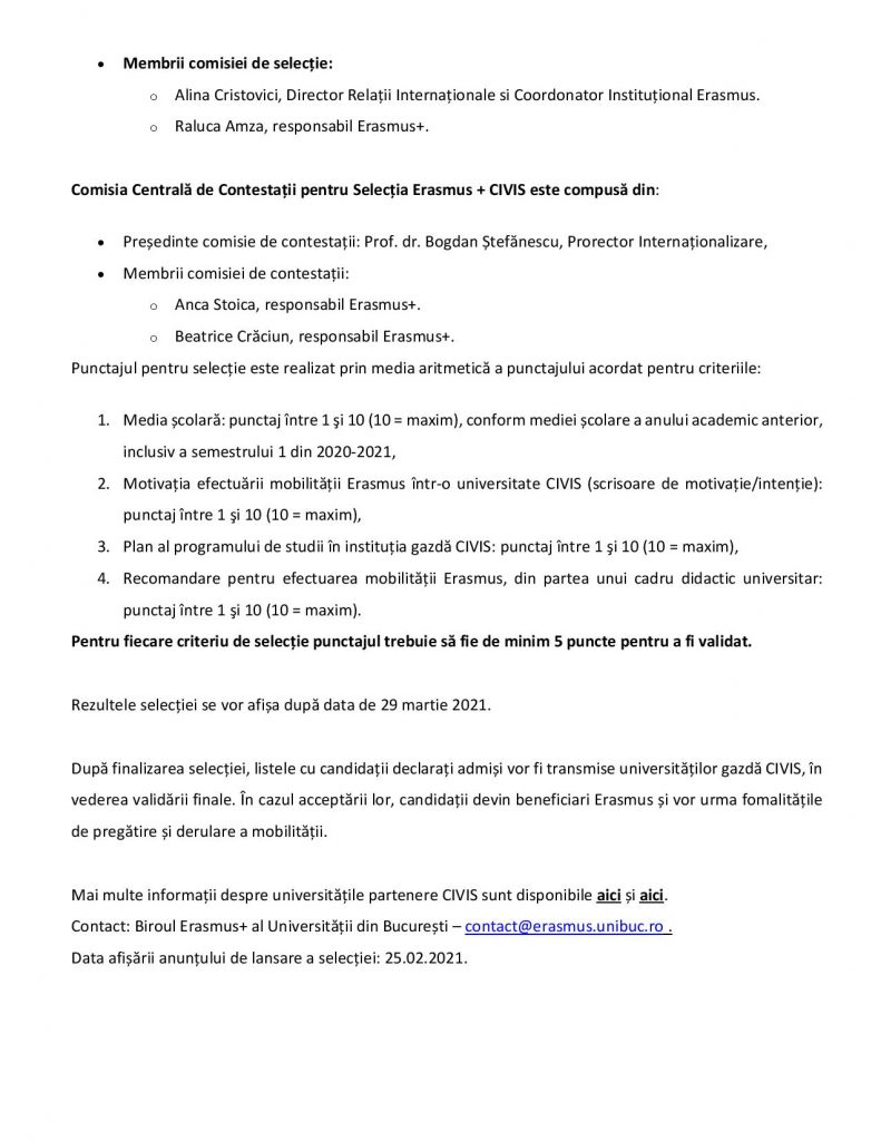 Detalii privind această selecție ERASMUS + CIVIS sunt disponibile la adresa https://unibuc.ro/international/programul-erasmus/studenti-erasmus/selectie/.