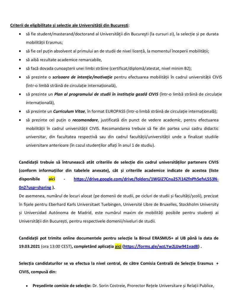 De asemenea, vă rugăm să diseminați informațiile legate de selecție, din documentul atașat, precum și a criteriile și condițiile partenerilor CIVIS pentru 2021-2022 (disponibile la adresa https://drive.google.com/drive/folders/1WGIZ7Cnu2S7i14ZfnPh5efvL553N-0n2?usp=sharing).